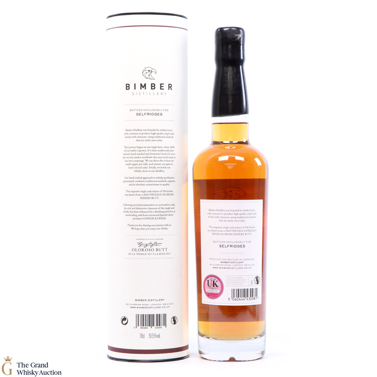 An exclusive partnership between the London distillery and department store Selfridges. This Bimber was made from single farm barley (which was malted at Westminster Maltings) and matured in four 1st fill American Oak Ex-bourbon casks. It was then finished in a single Oloroso sherry butt from hugely renowned Spanish sherry producer González Byass. Bottled in June 2020 at 51.5% ABV.