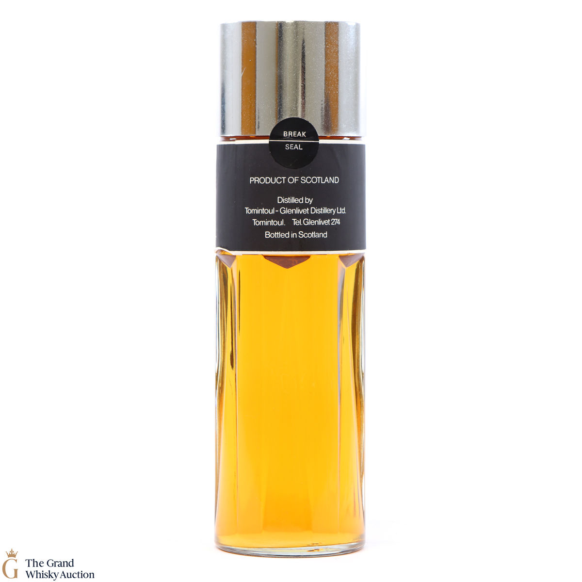 This 1970s bottle from the Tomintoul (Glenlivet) distillery is an unusual shape. It features a round, grooved/fluted glass and a large silver screwtop - often referred to as a perfume bottle style. Very different from the traditional bottleneck.