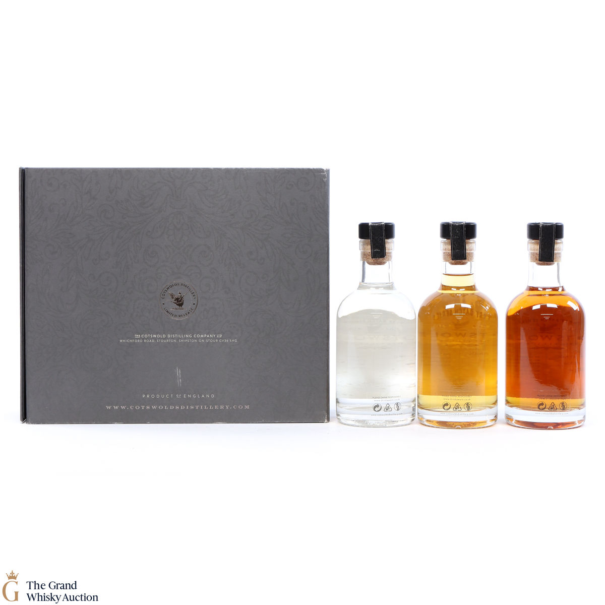 A giftbox set of 3 x 20cl bottles of Cotswolds Distillery new make malt spirit, Peated and ex-bourbon/STR spirit: