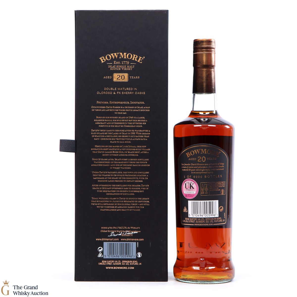 This 20-year-old celebrates and is a testament to the founder of Bowmore. This dram has gone through a double maturation period of 15 years in Oloroso Sherry Butts followed by 5 years in a first fill PX Butts. One of only 6000 bottles.