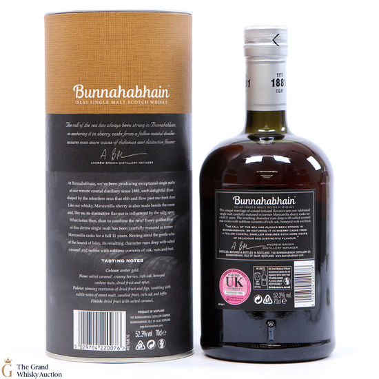 This limited release from Bunnahabhain and is a 2008 vintage Manzanilla cask matured single malt. Bottled in May 2020 at 52.3%. This 11-Year-Old, matured in warehouse 9 has rich flavours of nuts, fruits and toffee, with a salted caramel finish.