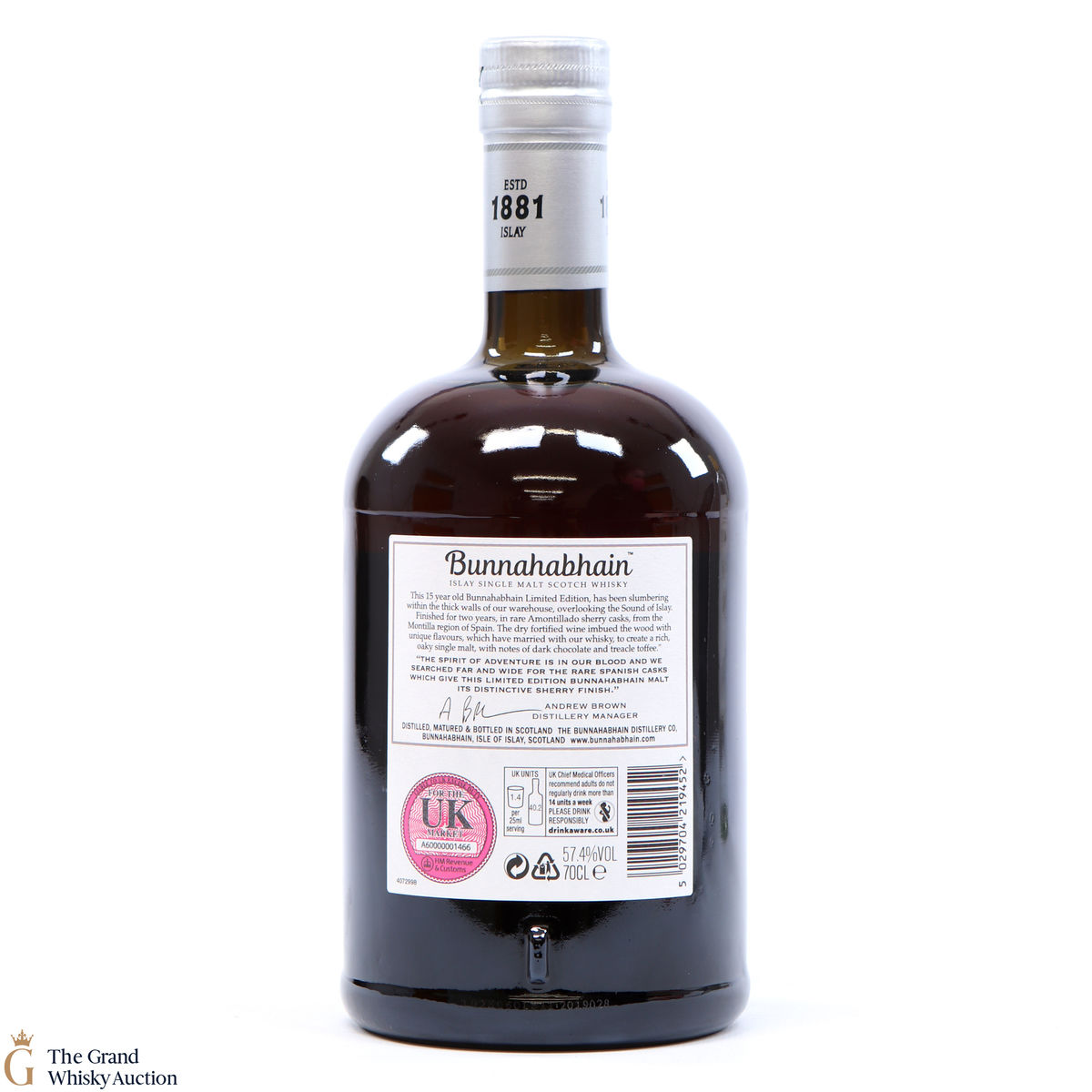 This is a 2019 distillery exclusive from Bunnahabhain Distillery. This Amontillado Cask Finish limited edition started life on the 20th of February 2003 in refill hogsheads before being transferred to Amontillado sherry hogsheads on the 26th of February 2016 where it spent two more years maturing in Bunnahabhain's coastal warehouses.