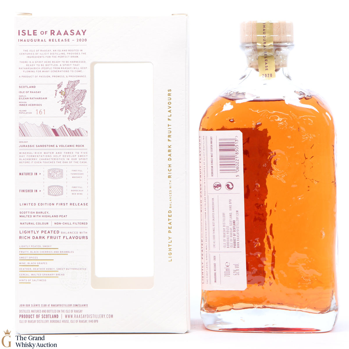 The inaugural release from the Isle of Raasay distillery is a limited edition release matured in first-fill American oak, and finished in 21 exclusive first fill Bordeaux red wine casks. They have created an elegant, lightly peated (15-20 Peat or Phenol Parts Per Million). Bottled at 52% and in a unique glass bottle which captures the island's geology.