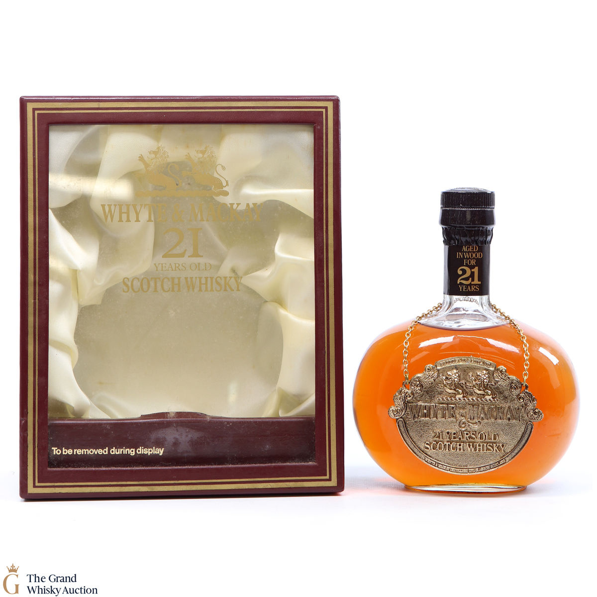 This is a very nicely presented bottle of 21-year-old blended whisky from Whyte & Mackay, which is believed to be produced in the 1980's. The bottle comes with a metallic tag that hangs from the neck of the decanter. It also comes in a beautiful silky lined presentation box.