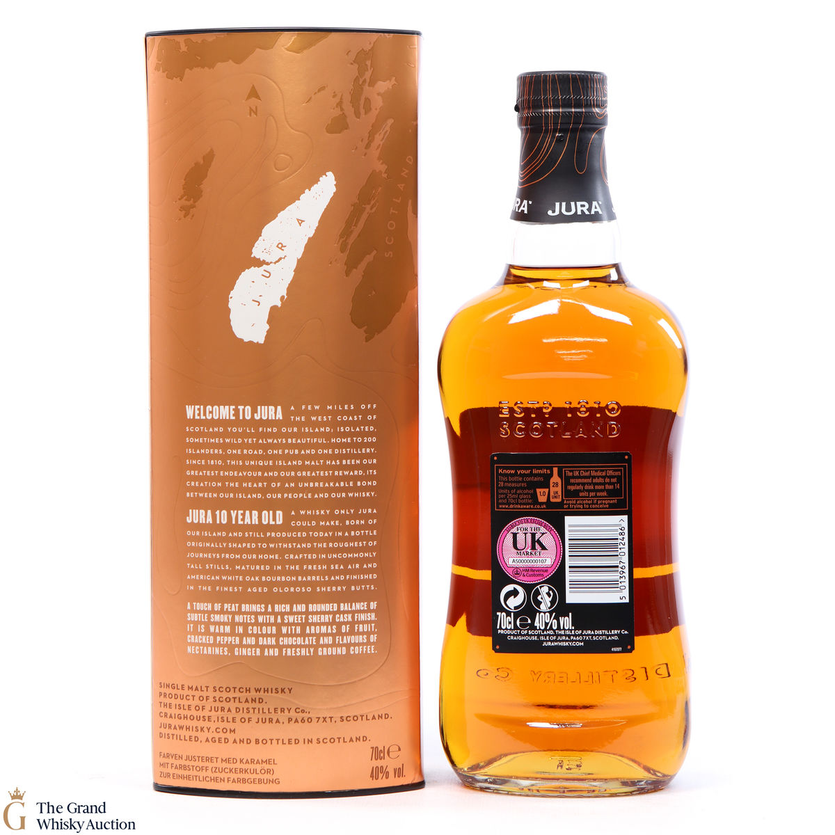 A bottle of Jura 10 Year Old. Originally built in 1810, the distillery fell into disrepair and wasn't revived until the 1960's by two local estate owners.