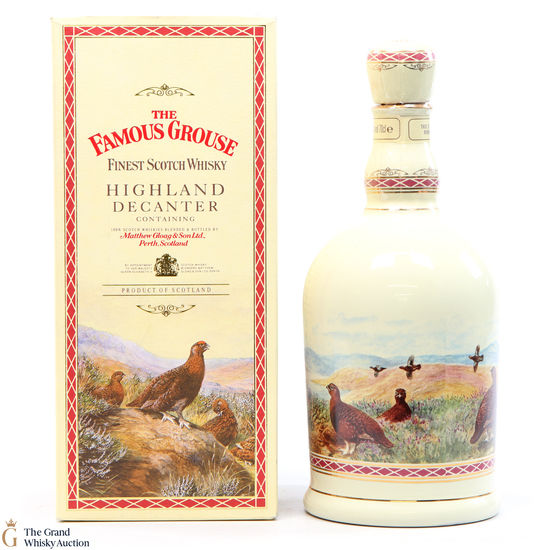 A bottle of Famous Grouse housed within a ceramic 'Highland' decanter. First blended by Matthew Gloag & Son in 1896, as of 2013, it has been the highest selling brand of whisky in Scotland since 1980.
