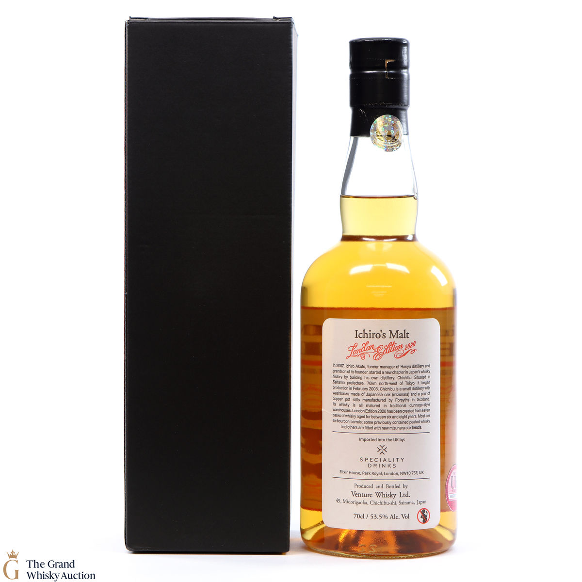 One of just 1736 bottles of the highlight sought after limited-edition Chichibu London (2020) bottlings from the Chichibu Distillery in Japan. Aged for six to eight years and vatted from a total of seven casks including some ex-bourbon barrels previously used to mature peated whisky and casks with new, mizunara-oak ends. Bottled at the cask strength of 53.5% ABV.