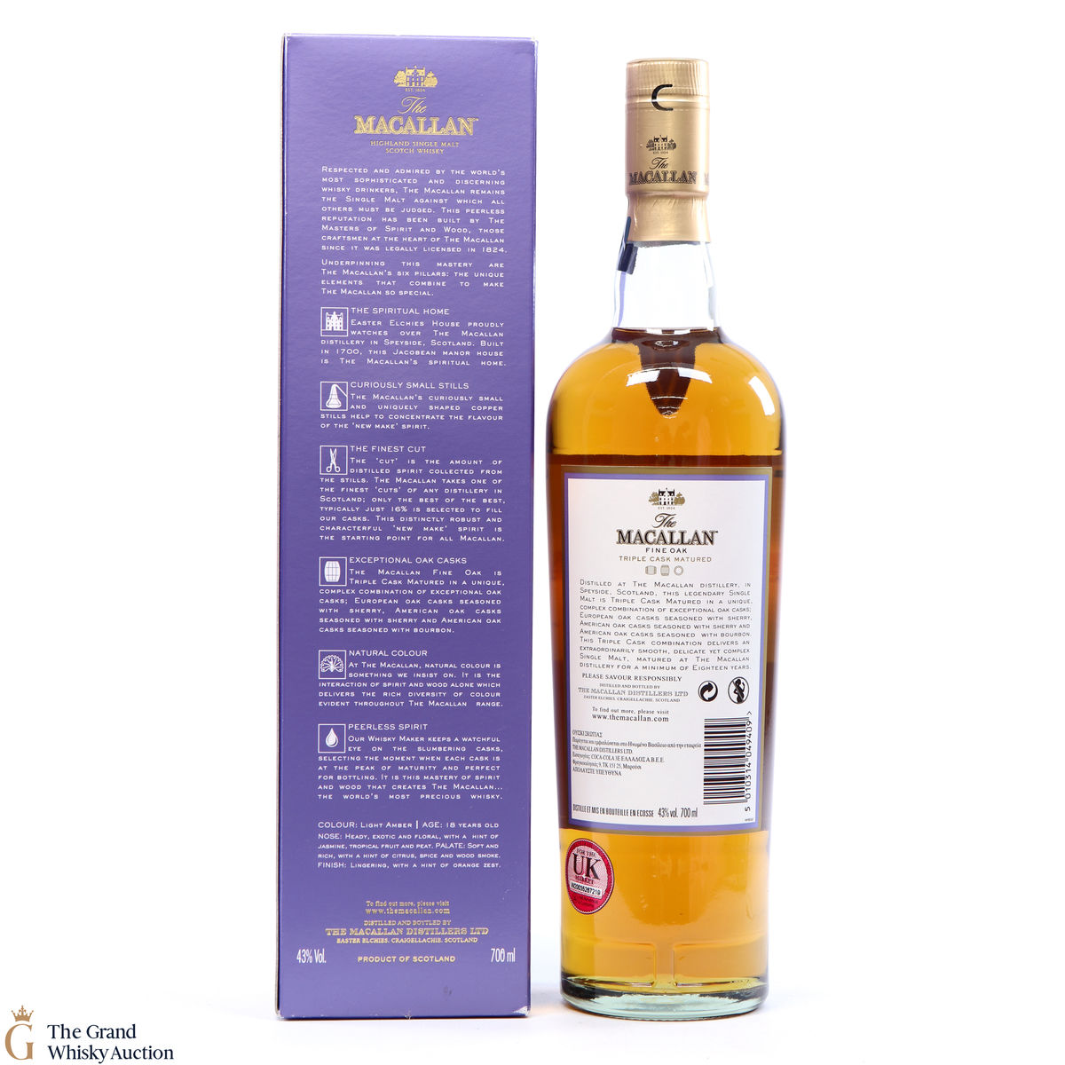 An 18 year old single malt, part of Macallan's Fine Oak range. It has been matured for eighteen years in three oak cask types; Europen oak seasoned with sherry, American oak seasoned with sherry and American oak seasoned with bourbon. This complex combination of casks has created a light amber single malt with tropical flavours balanced with wood smoke.
