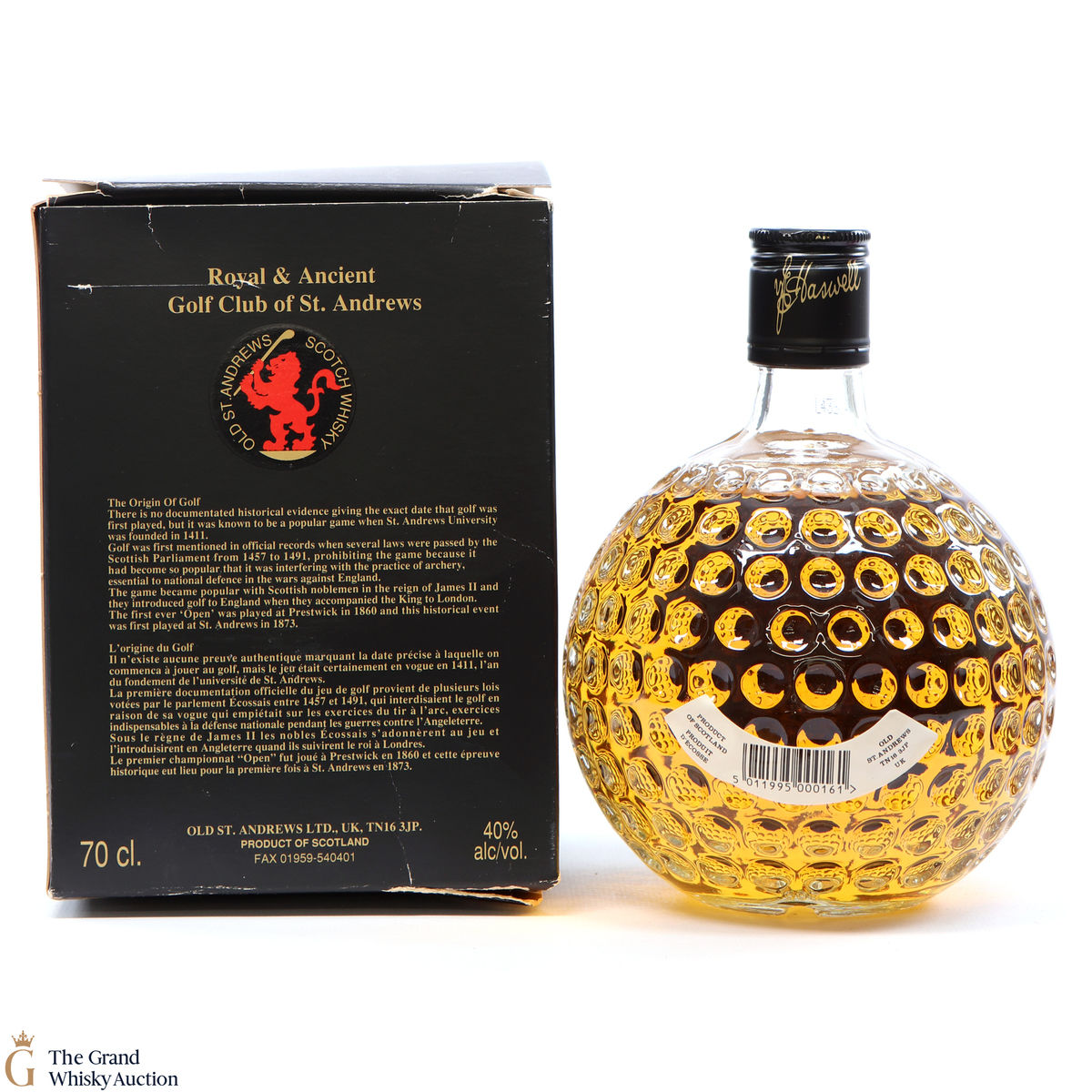 Old St Andrews Clubhouse, a blended whisky in the bottle form of a golf ball-shaped decanter.