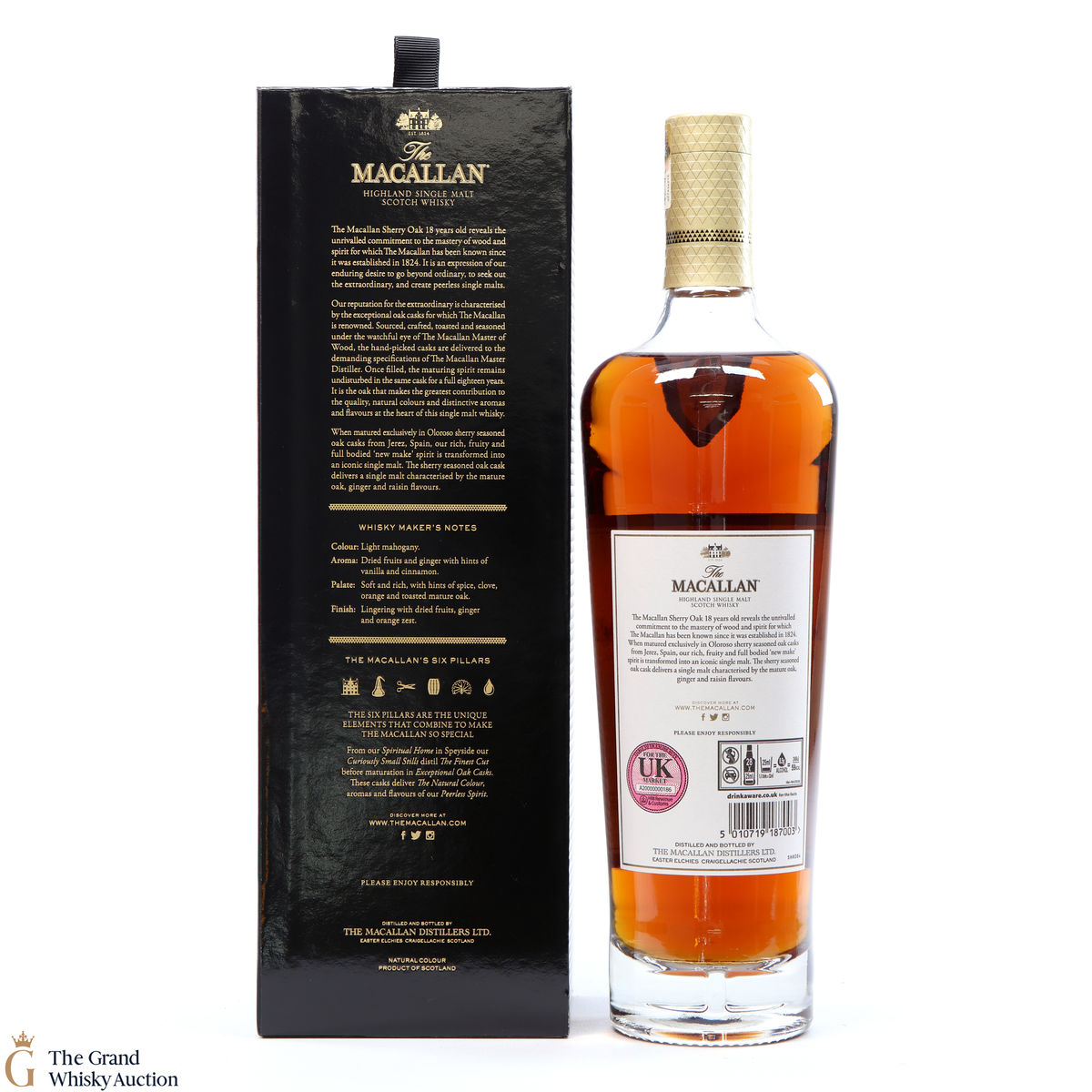 This annual release of The Macallan's popular 18 Year Old Sherry Oak is matured exclusively in sherry seasoned casks, built from both Spanish and American oak, providing a beautifully dark flavour with rich aromas.