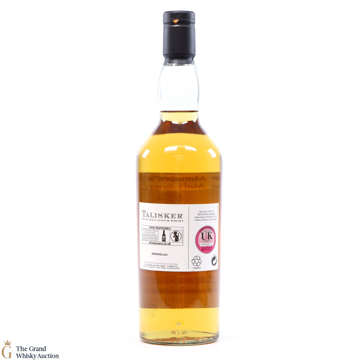 A rare Talisker single malt whisky bottled in 2011 for Diageo staff, at natural cask strength. The malt was specially selected by distillery managers within Diageo and bottled at 55.2%. This is an individually numbered bottle.
