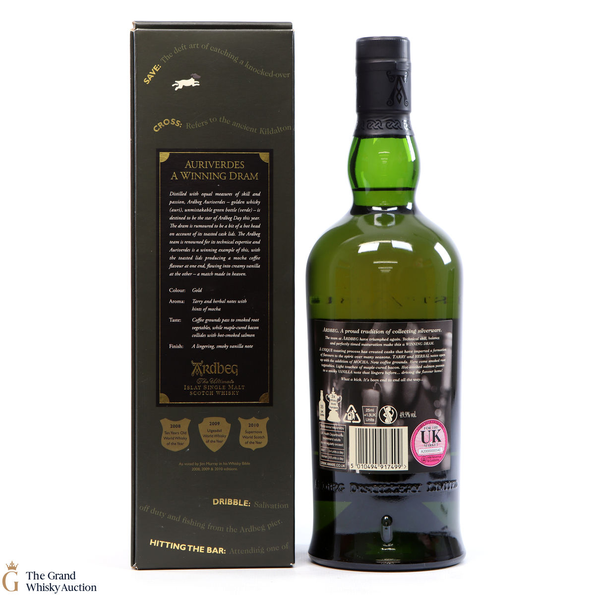 This special edition Ardbeg single malt was released on Ardbeg Day 2014. during Feis Ile. Auri(Gold) verdes (Green) it refers to the golden whisky and the iconic Ardbeg green bottle of Ardbeg whisky. It is said to be a dram of two halves - the whisky uses toasted cask lids to create Mocha Coffee flavours that team up with creamy vanilla.