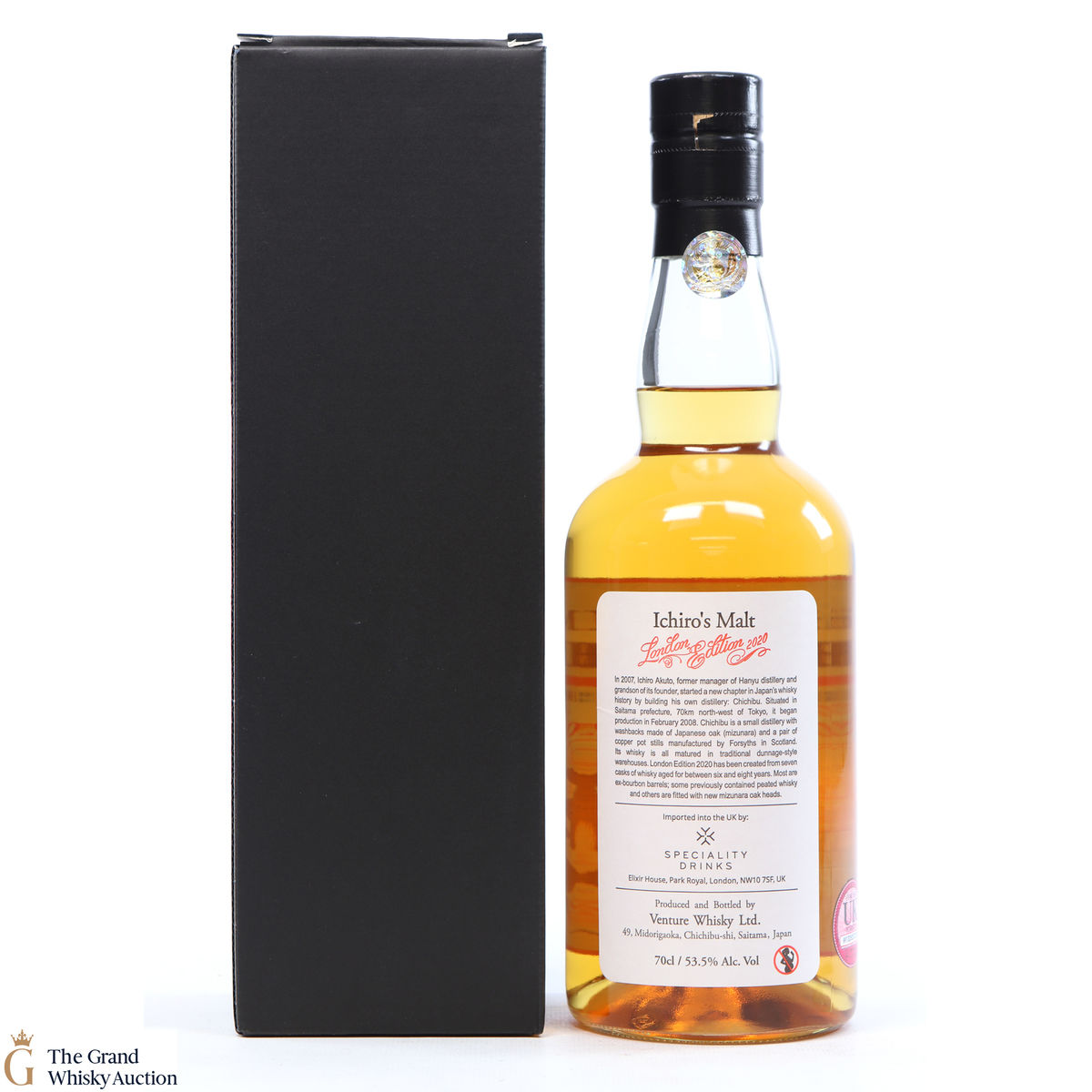 One of just 1736 bottles of the highlight sought after limited-edition Chichibu London (2020) bottlings from the Chichibu Distillery in Japan. Aged for six to eight years and vatted from a total of seven casks including some ex-bourbon barrels previously used to mature peated whisky and casks with new, mizunara-oak ends. Bottled at the cask strength of 53.5% ABV.
