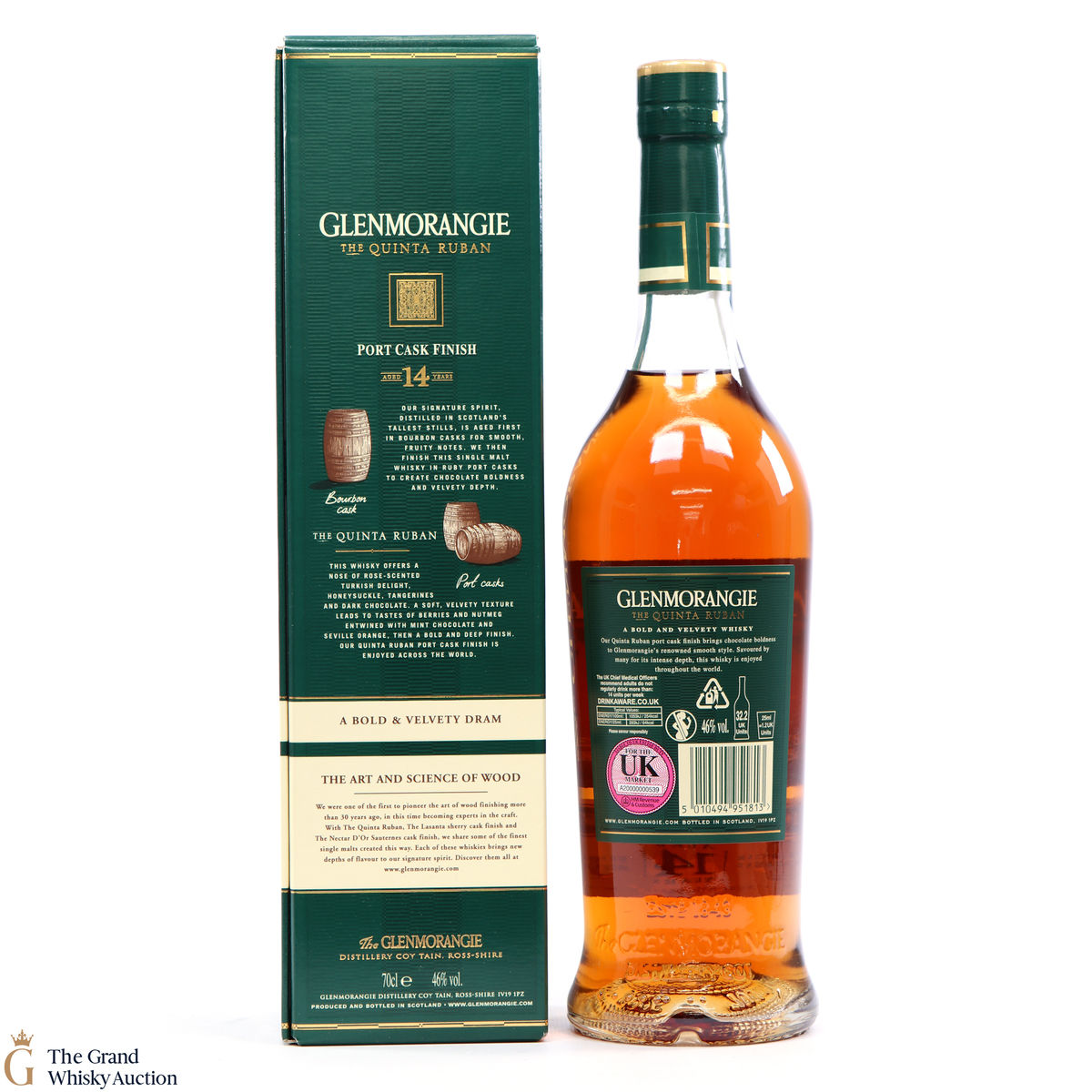 Glenmorangie Quinta Ruban is matured in bourbon casks before finishing in the finest Ruby Port casks from the "Quintas" or wine estates of Portugal. Ruban is Gaelic for Ruby.