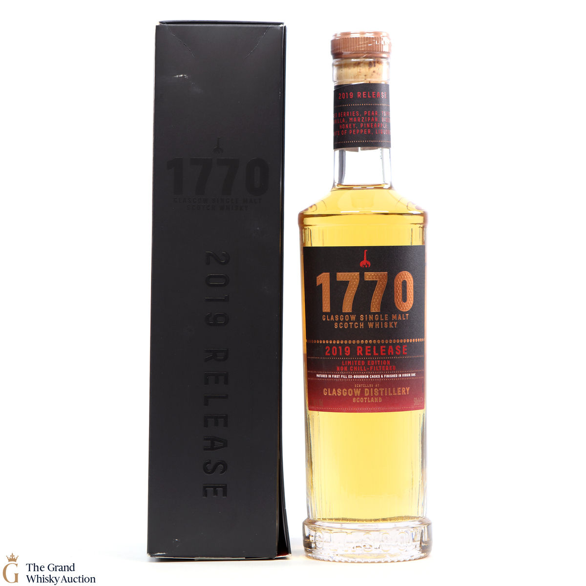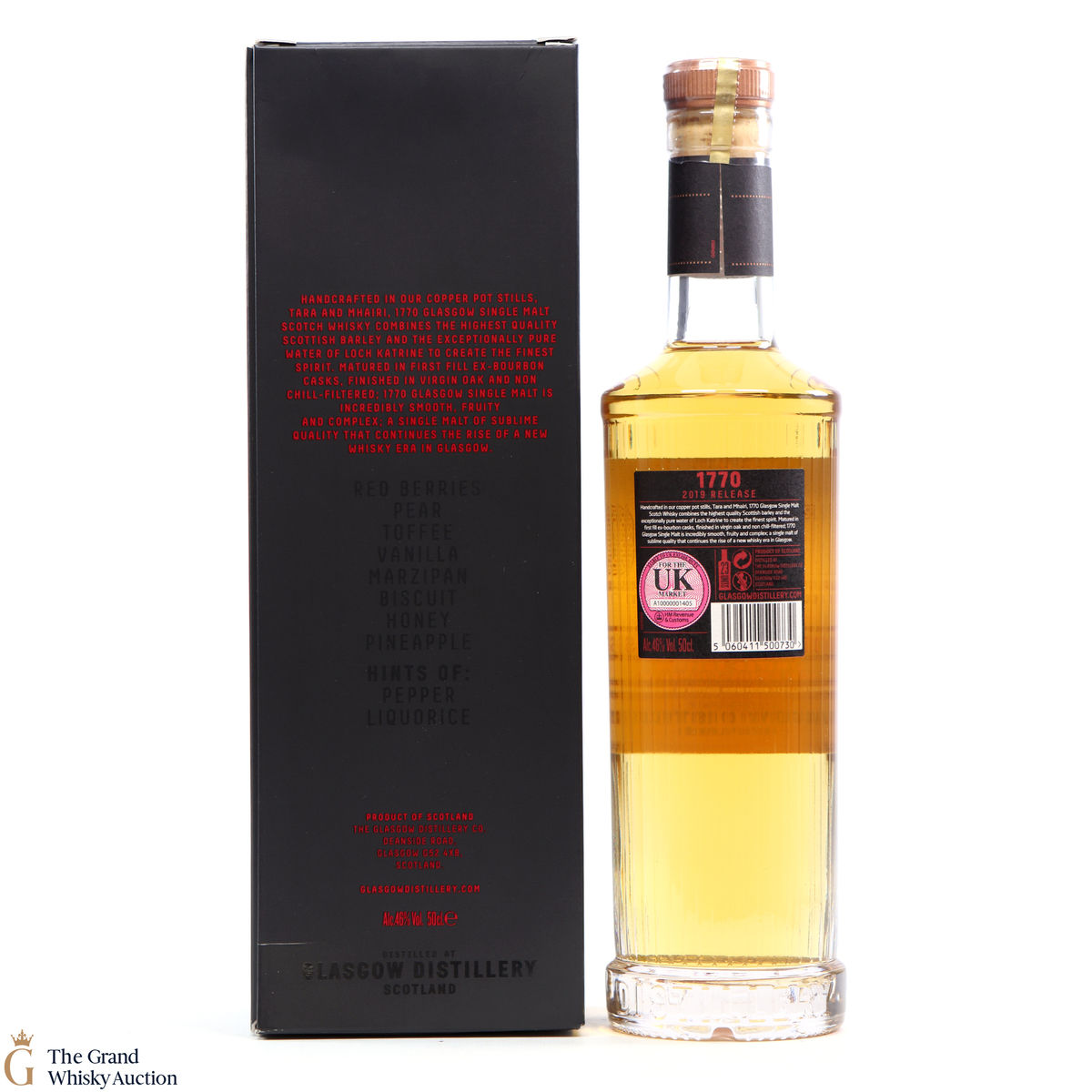 This is the 2019 release of 1770 Glasgow single malt from the Glasgow distillery, which brought whisky production back to the city for the first time in over 100 years. This limited-edition whisky was matured in first-fill bourbon casks and finished in virgin white oak.