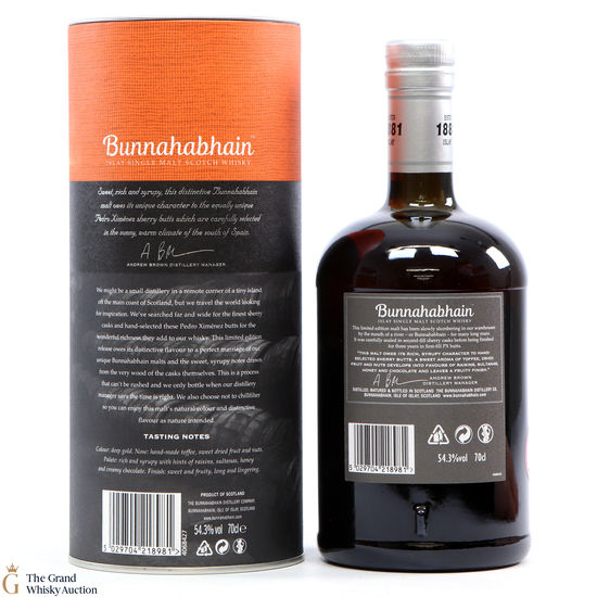 A limited-edition bottling from the Bunnahabhain distillery on the north-east coast of Islay. This is a 14-year-old single malt, distilled in 2003 and was initially aged in second-fill Sherry casks until 2011. At this point, the whisky was transferred over to yet more Sherry casks - first-fill Pedro Ximénez casks! It was bottled in 2017 at cask strength. This is one of 6768 individually numbered bottles.