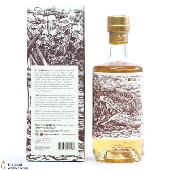 This is a limited edition bottle created in Arctic Norway was 'handcrafted under the Northern Lights'. Matured in bourbon casks and given a finishing period of 5-6 months in nicely seasoned, well-travelled casks. Bivrost Nidavellir is the second Whisky in the “nine worlds of Norse mythology” series. This is a 50cl bottling.