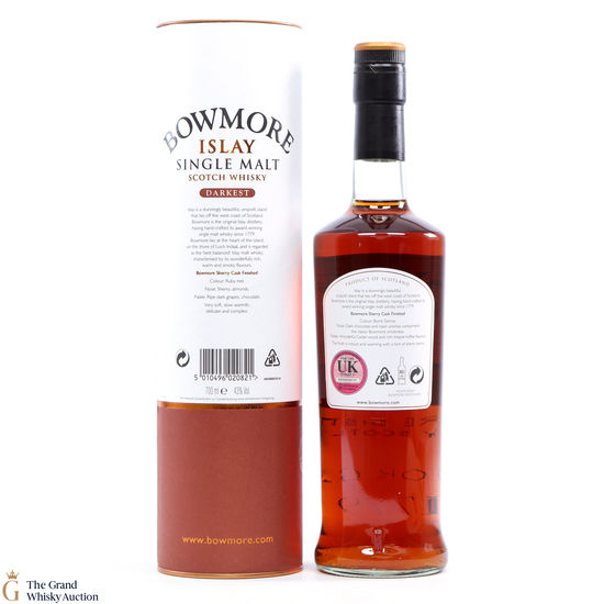 The Bowmore Darkest has been matured in Bourbon casks initially, but the final three years the single malt spent in Oloroso sherry casks gives the whisky its rich, deep colour. This 15 year old was bottled at 43% abv.