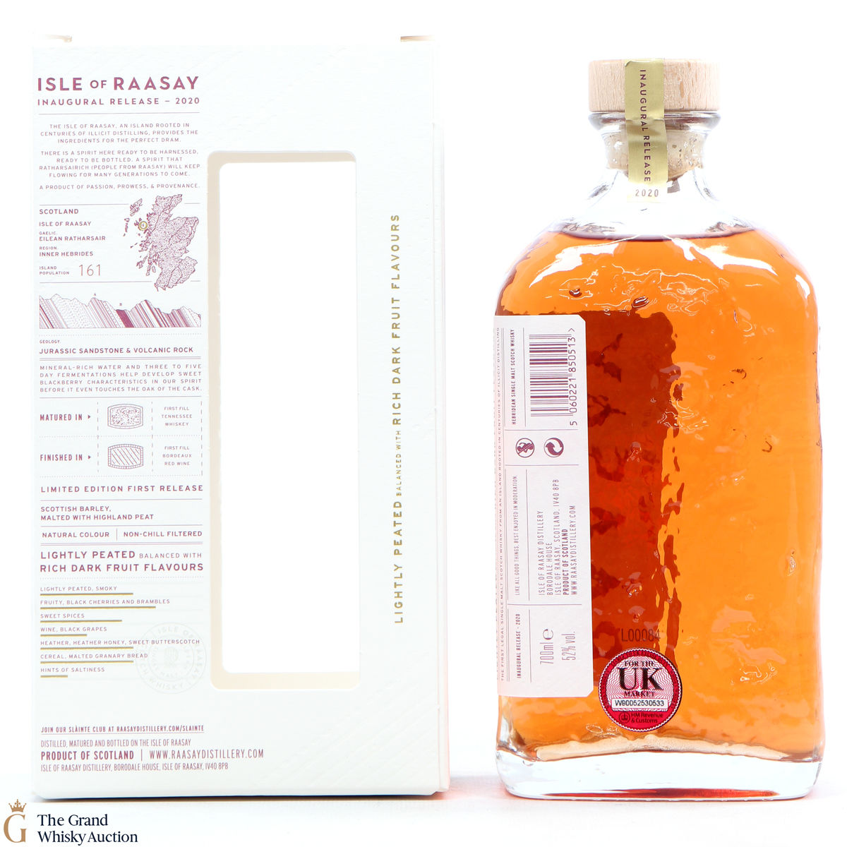 The inaugural release from the Isle of Raasay distillery is a limited edition release matured in first-fill American oak, and finished in 21 exclusive first fill Bordeaux red wine casks. They have created an elegant, lightly peated (15-20 Peat or Phenol Parts Per Million). Bottled at 52% and in a unique glass bottle which captures the island's geology.