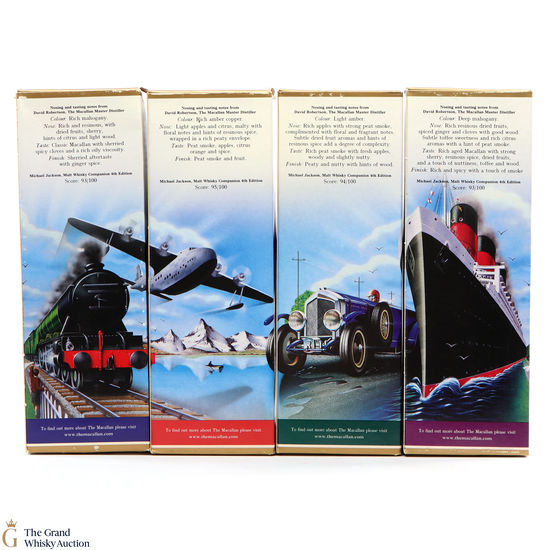 This lot includes a full set of the Macallan Travel Series: 1920s, 1930s 1940s & 1950s, each in their presentation boxes. 4 x 50cl.