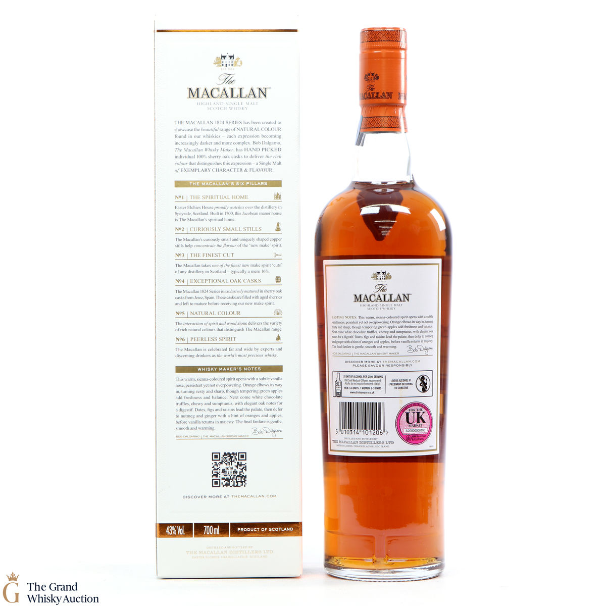 The Macallan 1824 Series celebrates natural colour. The most distinctive and defining characteristic of Macallan is the sherry-seasoned oak casks that are used to mature the whisky. This series shows commitment to 100% natural colour, drawn from wood. The colour of each expression becomes deeper as the range progresses.