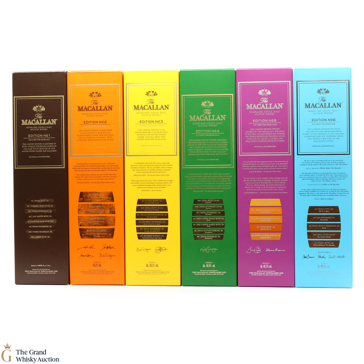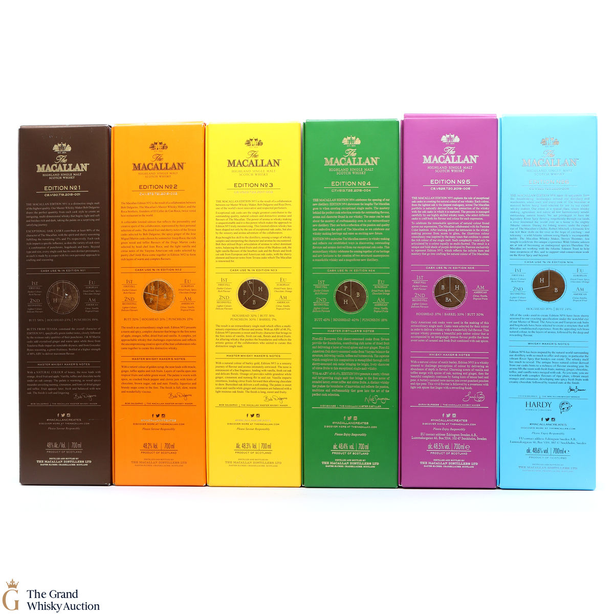 This lot brings together the Macallan Edition set to date, comprising of Edition no. 1, 2, 3 4, 5 & 6 in the annual limited edition series.