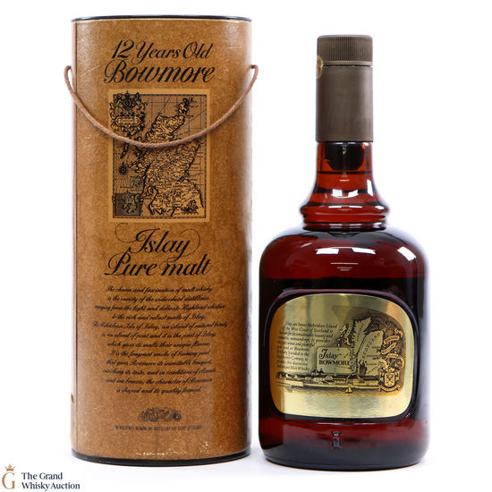 This is an iconic old dumpy style 75cl bottle of Bowmore 12-year-old Bowmore estimated to be from the 1980s. It was bottled when the distillery was Morrison's Bowmore before it was bought over by Suntory in 1989.