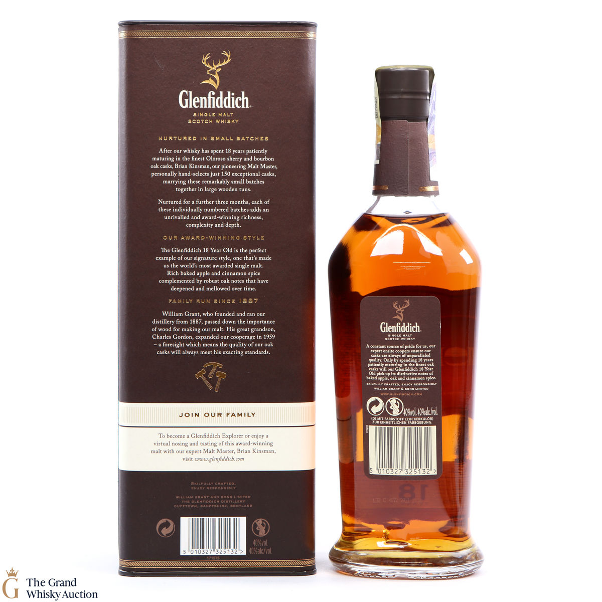 Matured in small batches the Glenfiddich 18 is arguably the most complex in the core range. The single malt has been matured in oloroso sherry and bourbon casks. It is very fragrant with tropical fruit and sherry cask influences, rich baked apple and cinnamon spice compliments by robust oak notes.