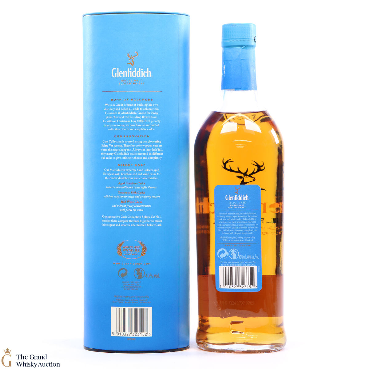 Part of a Glenfiddich's Casks Collection, Select Cask has been matured in a combination of European oak, ex-bourbon and ex-red-wine casks specially selected by malt master Brian Kinsman. It was then married in a solera vat. This is a 1 litre bottling.