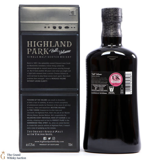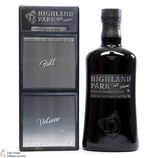 Full Volume by Highland Park was distilled in 1999 and bottled in 2017 from 481 casks. The single malt was matured exclusively in first-fill bourbon casks and was bottled at 47.2% ABV and comes presented in a themed presentation box resembling speaker.