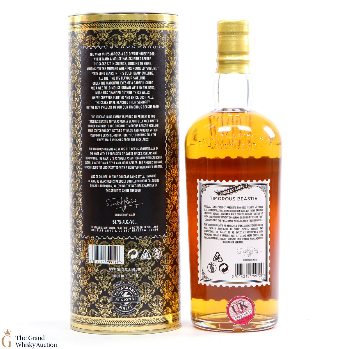 This Timorous Beastie Highland blended malt Scotch whisky was matured for 40 years and bottled at the cask strength of 54.7% ABV. Distilled, matured, vatted and bottled by Douglas Laing & Co. Ltd. This is one of just 1,080 bottles produced.