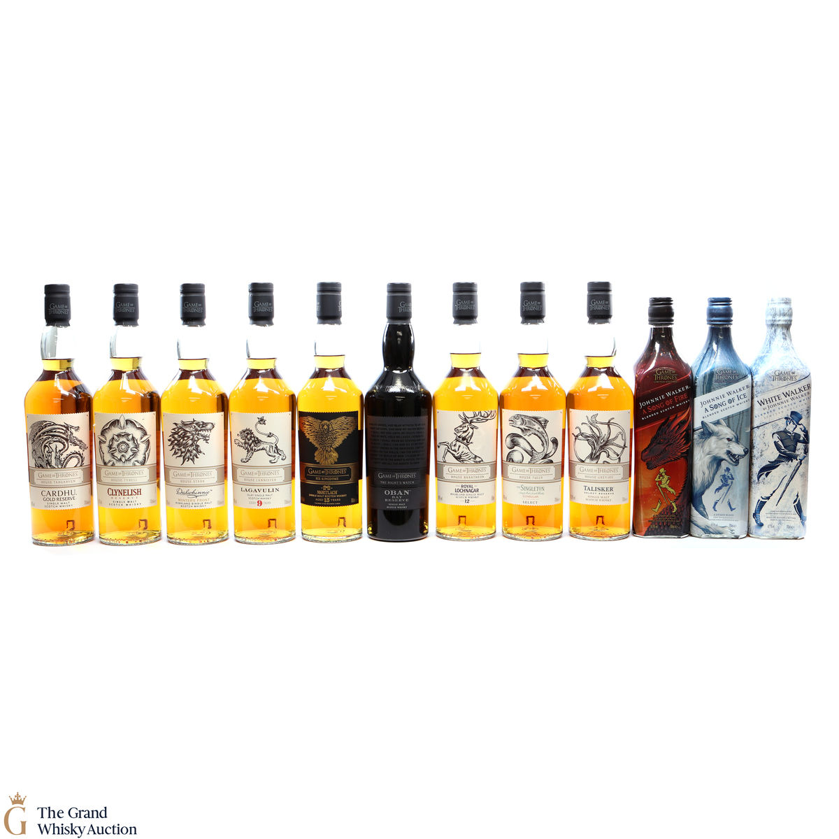 Game of Thrones series plus Johnnie Walker White Walker Game of Thrones edition, Song of Fire and Mortlach, Six Kingdoms edition. This lot includes 12 x 70cl.