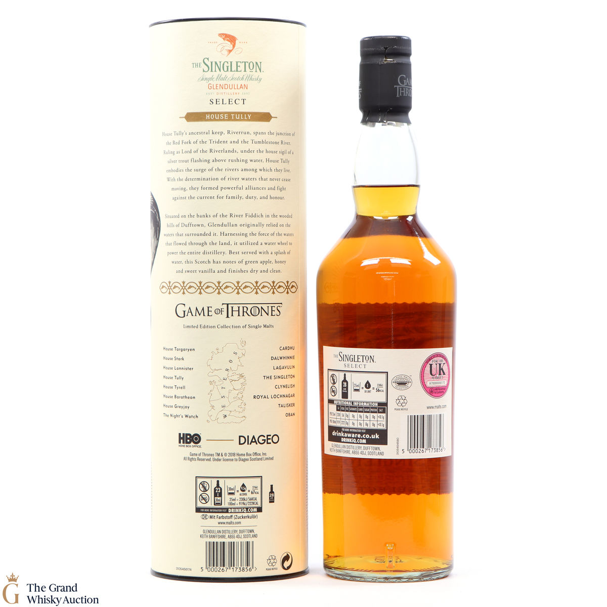The Singleton Glendullan Reserve hails from Dufftown distillery. Glendullan is located on the banks of the River Fiddich, so it has been cleverly paired with House Tully at Riverrun, which is in the region known as The Riverlands. This single malt Scotch whisky is decorated with a jumping trout - the sigil of House Tully.