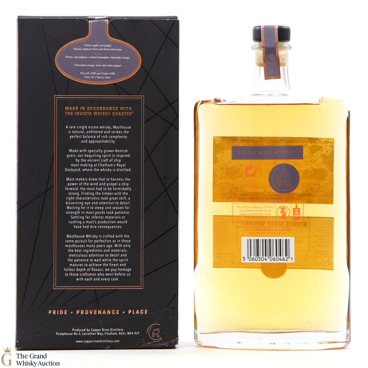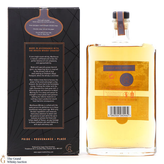 Masthouse Single Malt, made in accordance with the distillery's very own Invicta Whisky Charter. This expression is distilled from Kentish malted barley from the nearby Isle of Sheppey, and was aged in a combination of ex-bourbon and virgin American white oak barrels.