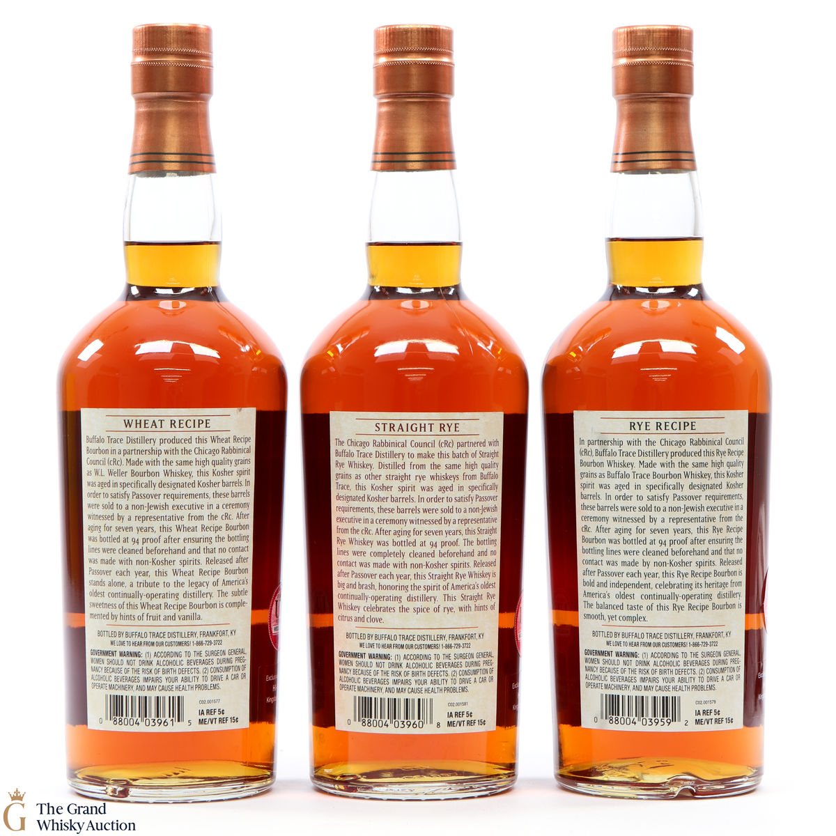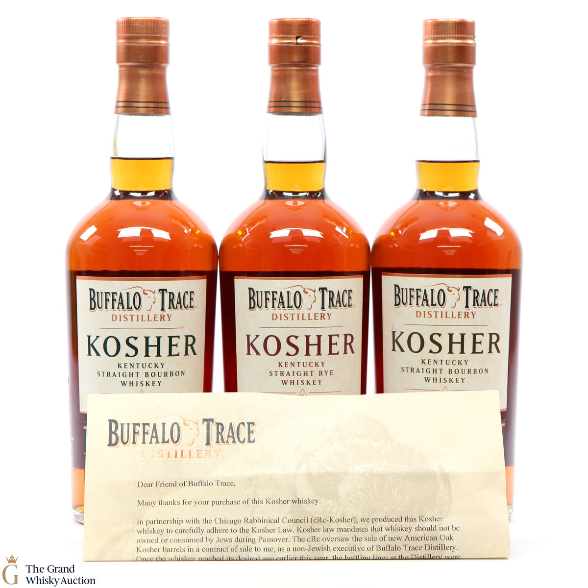 Included is a set of 3 Buffalo Trace Kosher bottles; Buffalo Trace - Rye, Buffalo Trace - Straight Rye and Buffalo Trace - Wheat