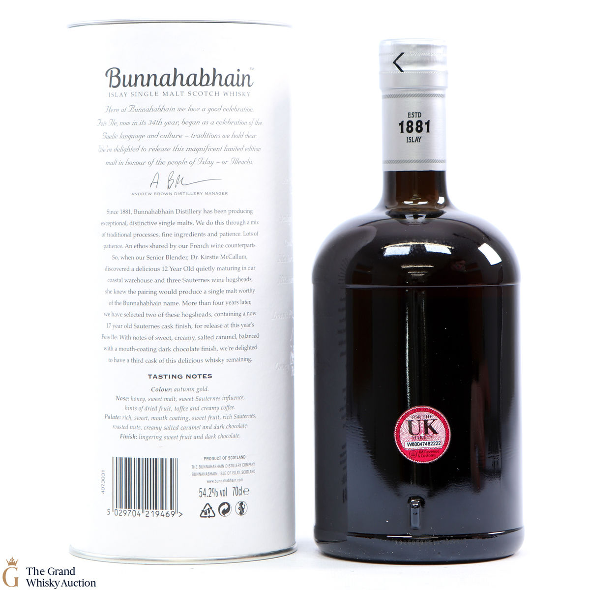 This limited edition single malt from Bunnahabhain Distillery has been matured for 17 years. For the last 5 years, the whisky was finished in Sauternes hogsheads. This release is one of 3 by Bunnahabhain for Fèis Ìle 2019. It has been bottled at 54.2% ABV. This is one of only 1118 bottles produced.