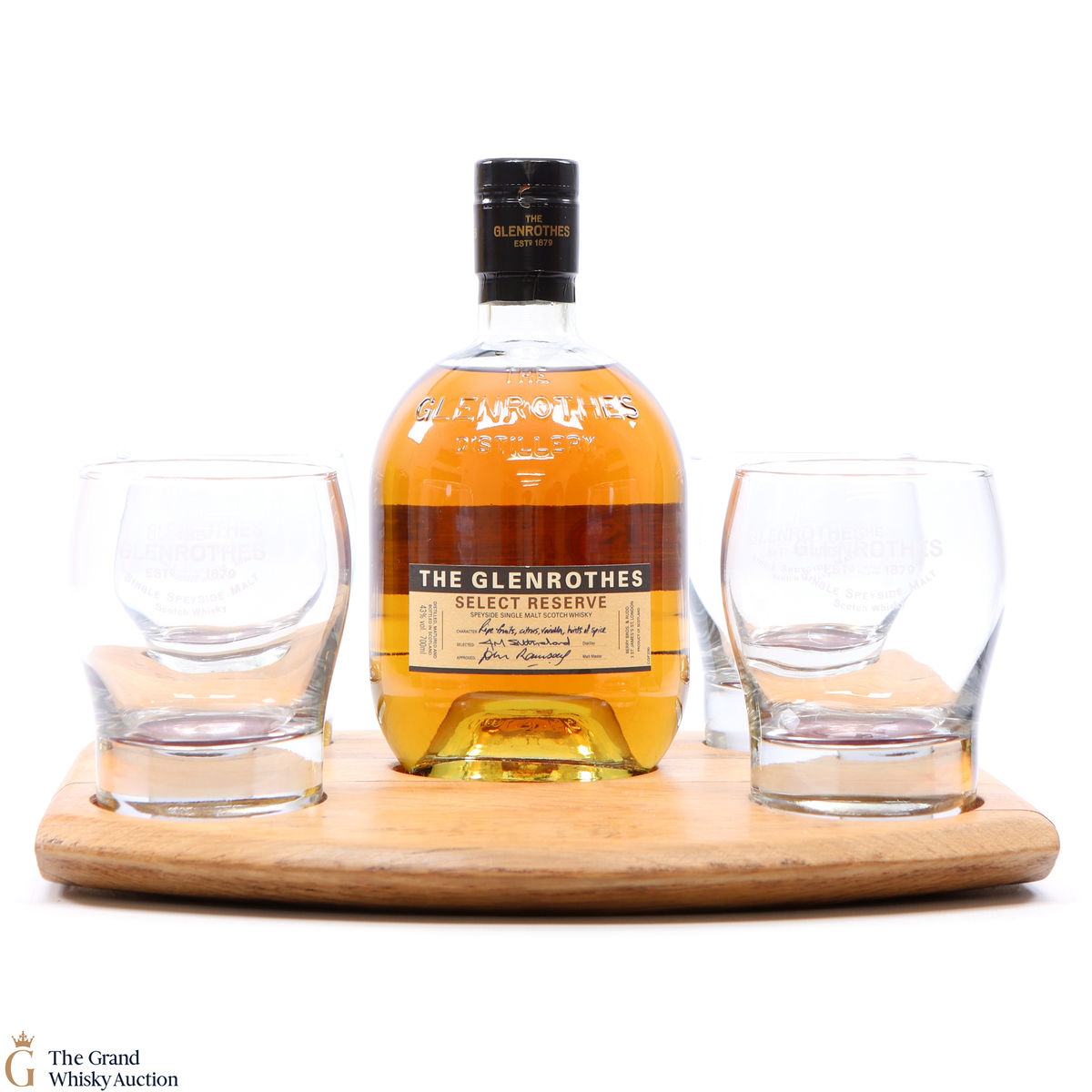 Included in this bundle is the Glenrothes Select Reserve, 4 large glasses and a large wooden plinth.