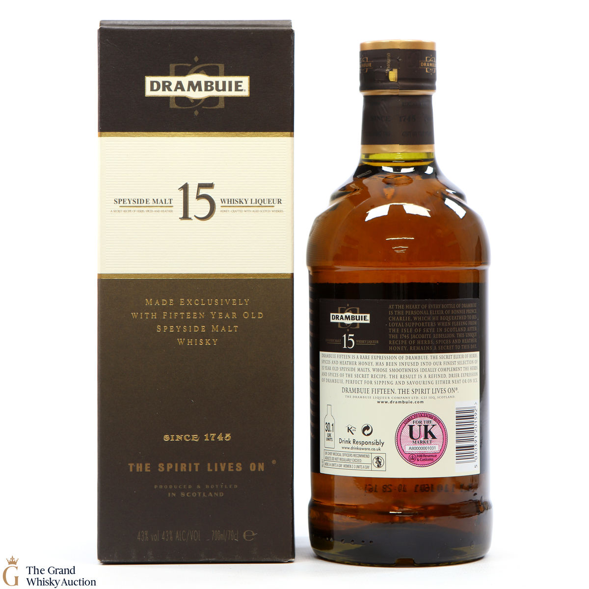 This bottling of Drambuie Whisky Liqueur is a selection of their finest 15-year-old Speyside malts. Produced and bottled in Scotland at an ABV of 43%.