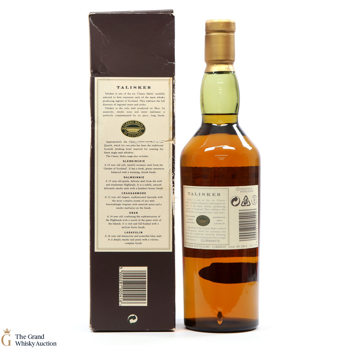 An older release of 10 Year Old from Talisker distillery on the Isle of Skye. Aged for a minimum of 10 years in American oak casks. The bottle label and the box feature a map of Skye.