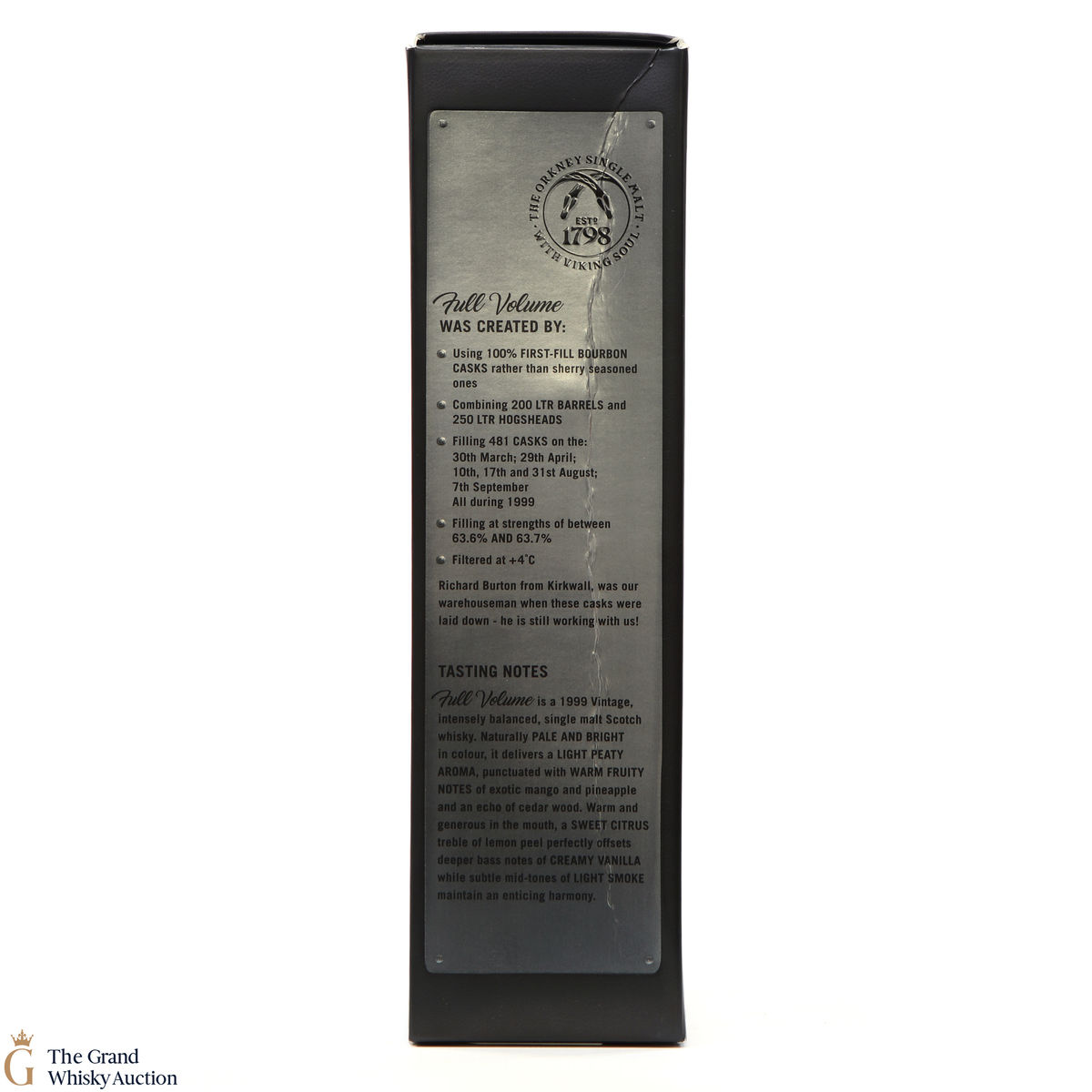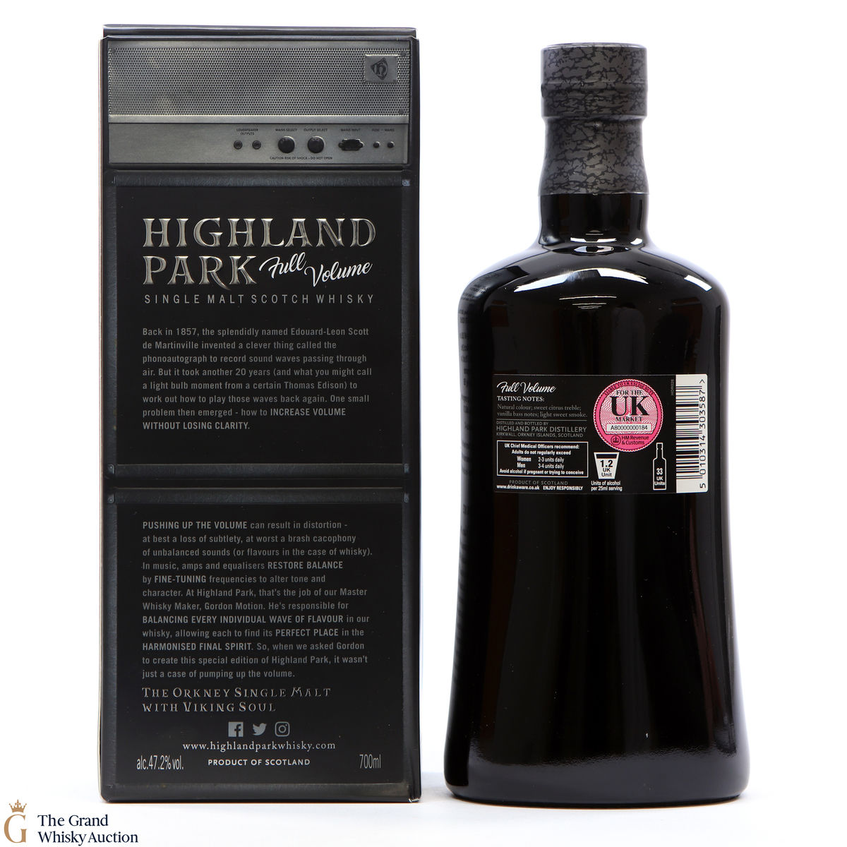 Full Volume by Highland Park was distilled in 1999 and bottled in 2017 from 481 casks. The single malt was matured exclusively in first-fill bourbon casks and was bottled at 47.2% ABV and comes presented in a themed presentation box resembling speaker.