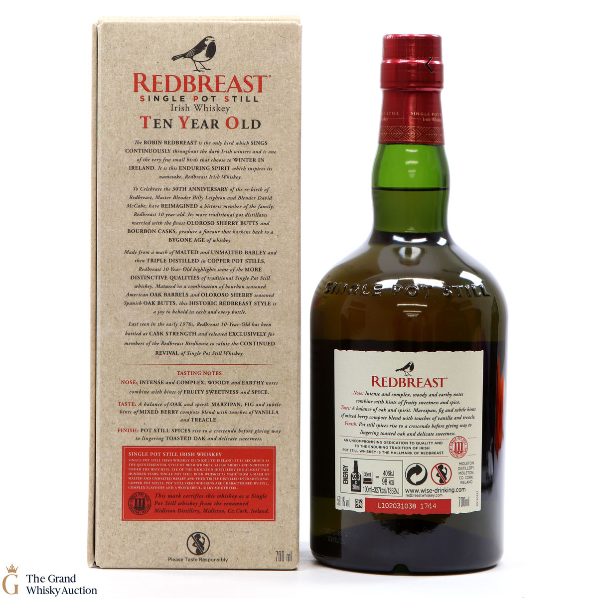 Redbreast 10 Year Old is a Bird House Exclusive bottling to celebrate the 30th anniversary of the re-birth of the Redbreast. Matured in a combination of bourbon seasoned American oak barrels and Oloroso sherry seasoned Spanish oak butts before being bottled at cask strength of 59.1% ABV is from batch 1.