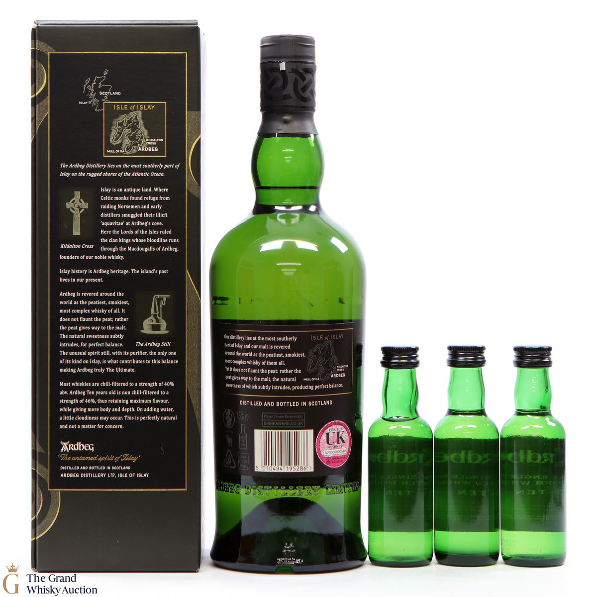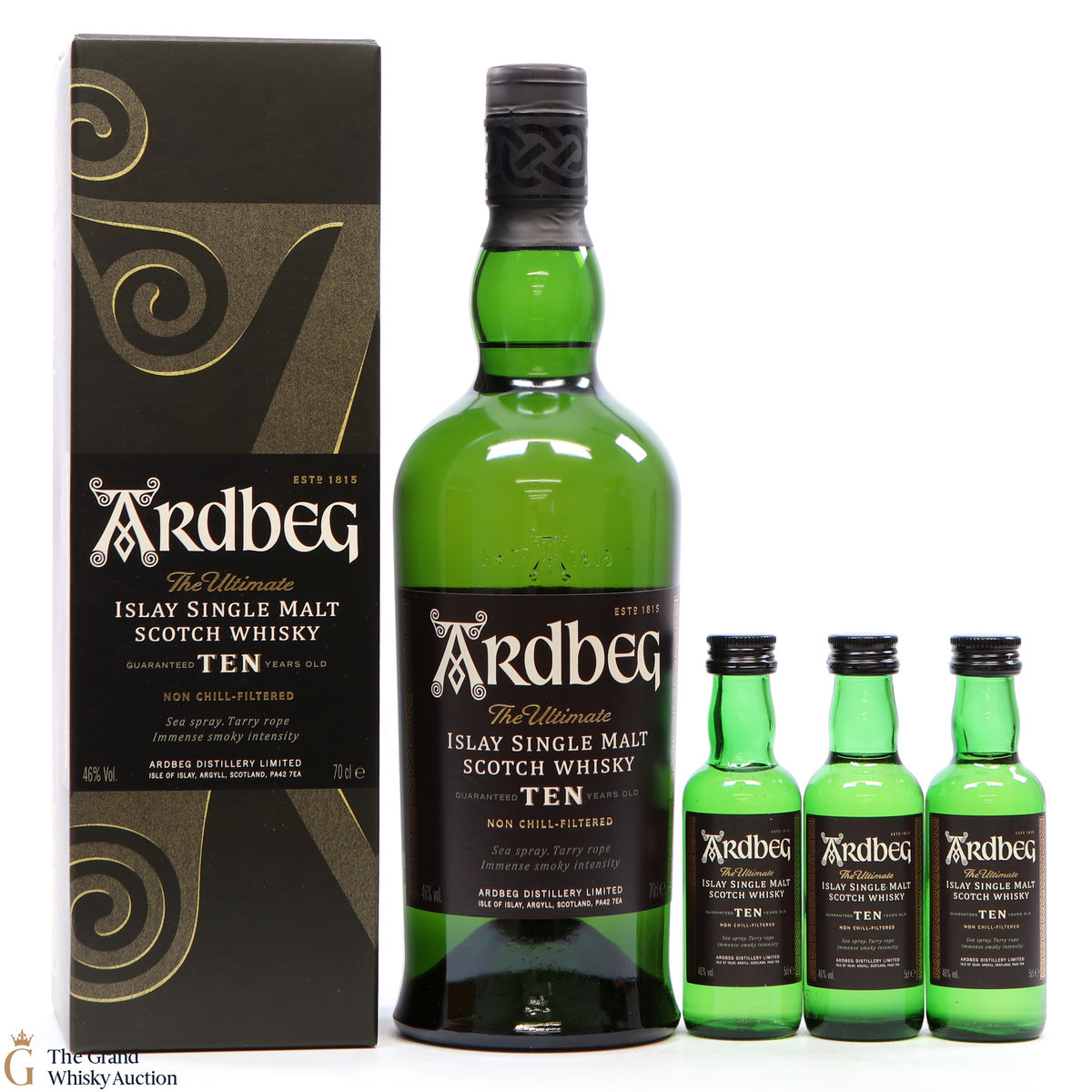 This lot contains a 70cl Ardbeg - 10 Year Old, 3 x 5cl 10 Year Old Minis and a Ardbeg USB.
