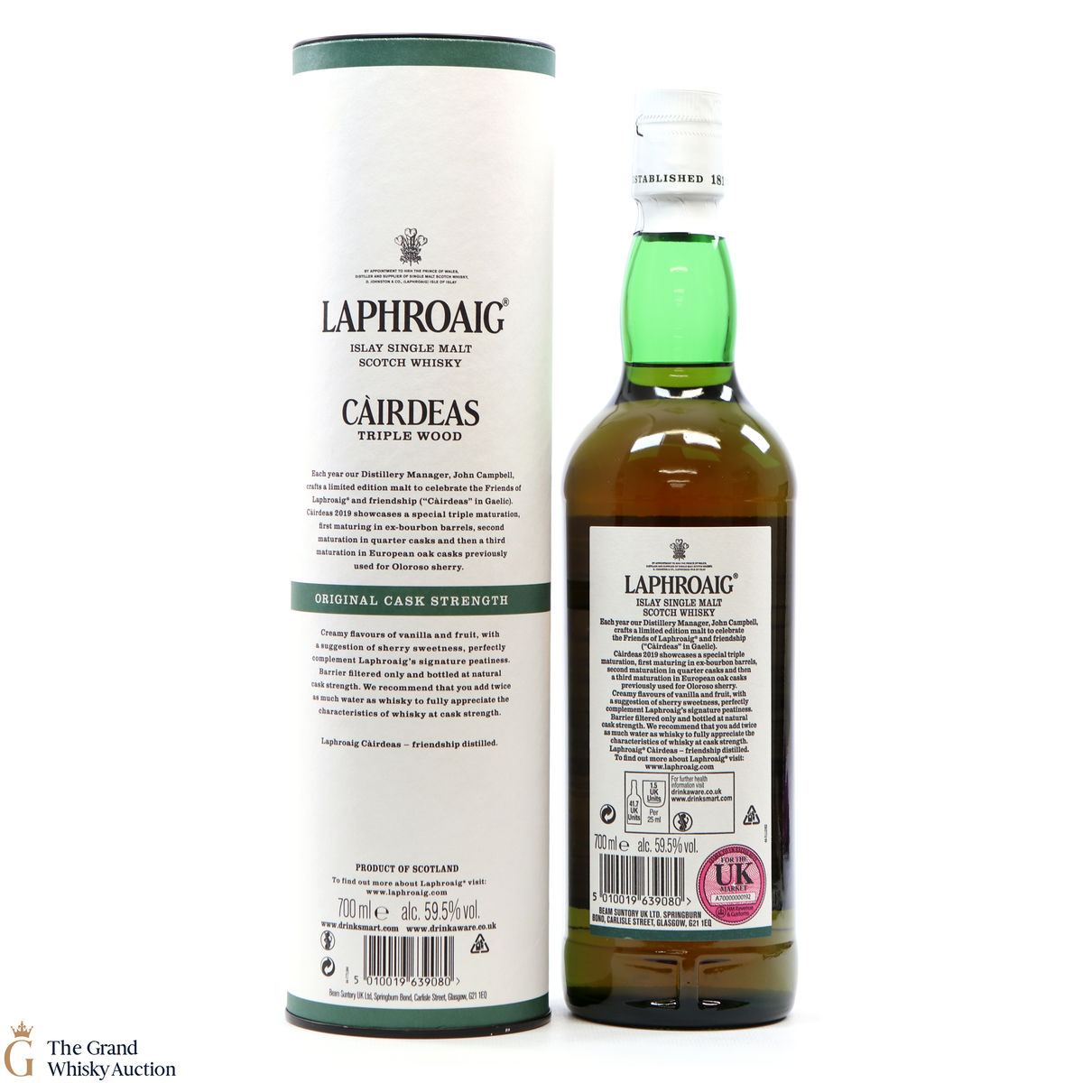 Cairdeas, Gaelic for 'friendship', is an annual bottle release by Laphroaig for their Friends of Laphroaig members. This Càirdeas Triple Wood Cask Strength was released for Fèis Ìle 2019. It has had a special triple maturation; first matured in ex-bourbon barrels, then in quarter casks and finally in European oak casks which previously held oloroso sherry.