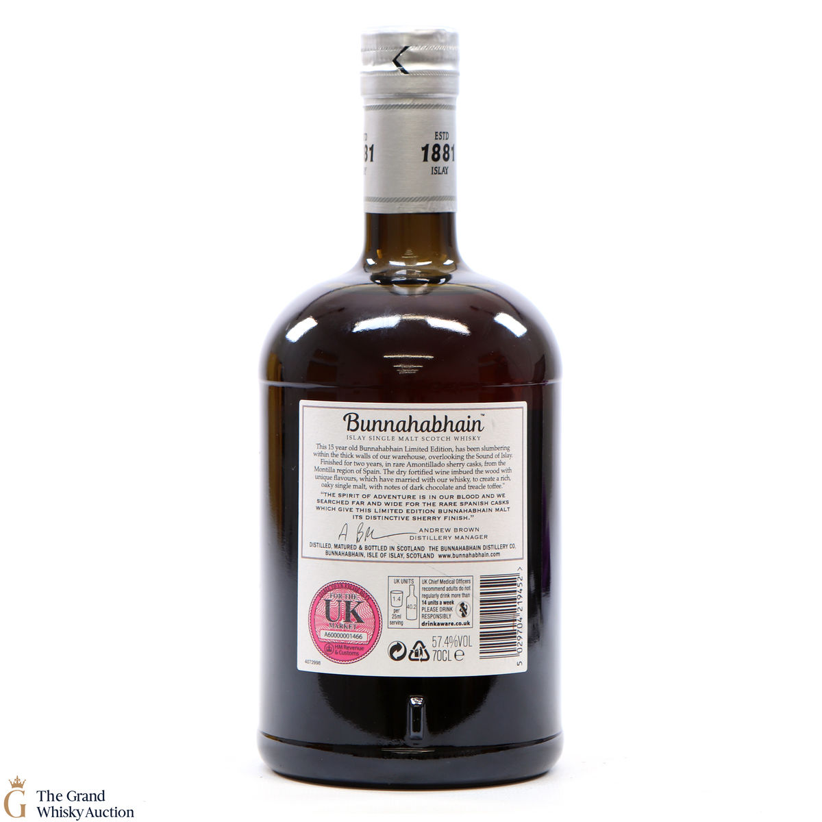 This is a 2019 distillery exclusive from Bunnahabhain Distillery. This Amontillado Cask Finish limited edition started life on the 20th of February 2003 in refill hogsheads before being transferred to Amontillado sherry hogsheads on the 26th of February 2016 where it spent two more years maturing in Bunnahabhain's coastal warehouses.