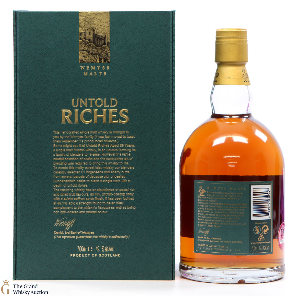 This handcrafted single malt is brought to you by the Wemyss family. Distilled at Bunnahabhain distillery, the Untold Riches 28 Year Old is a single malt held in hogsheads and sherry butts from several parcels of decades old, unpeated Bunnahabhain casks.