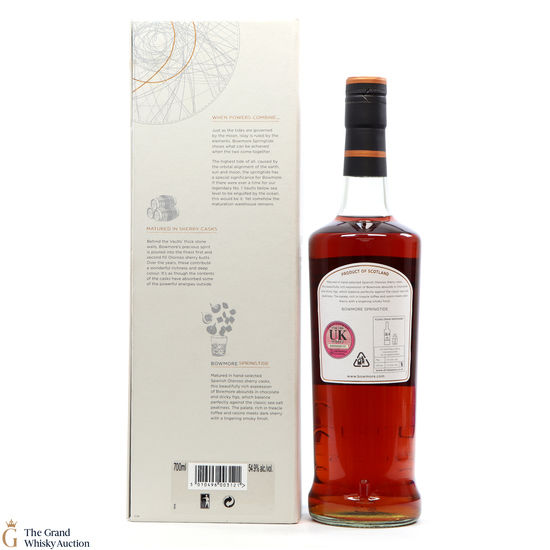 Distilled at Bowmore Distillery, this single malt was matured in hand-selected Spanish Oloroso sherry casks. Named 'Springtide', this is when the Earth, Sun and Moon are all aligned, which causes the highest tide of all.
