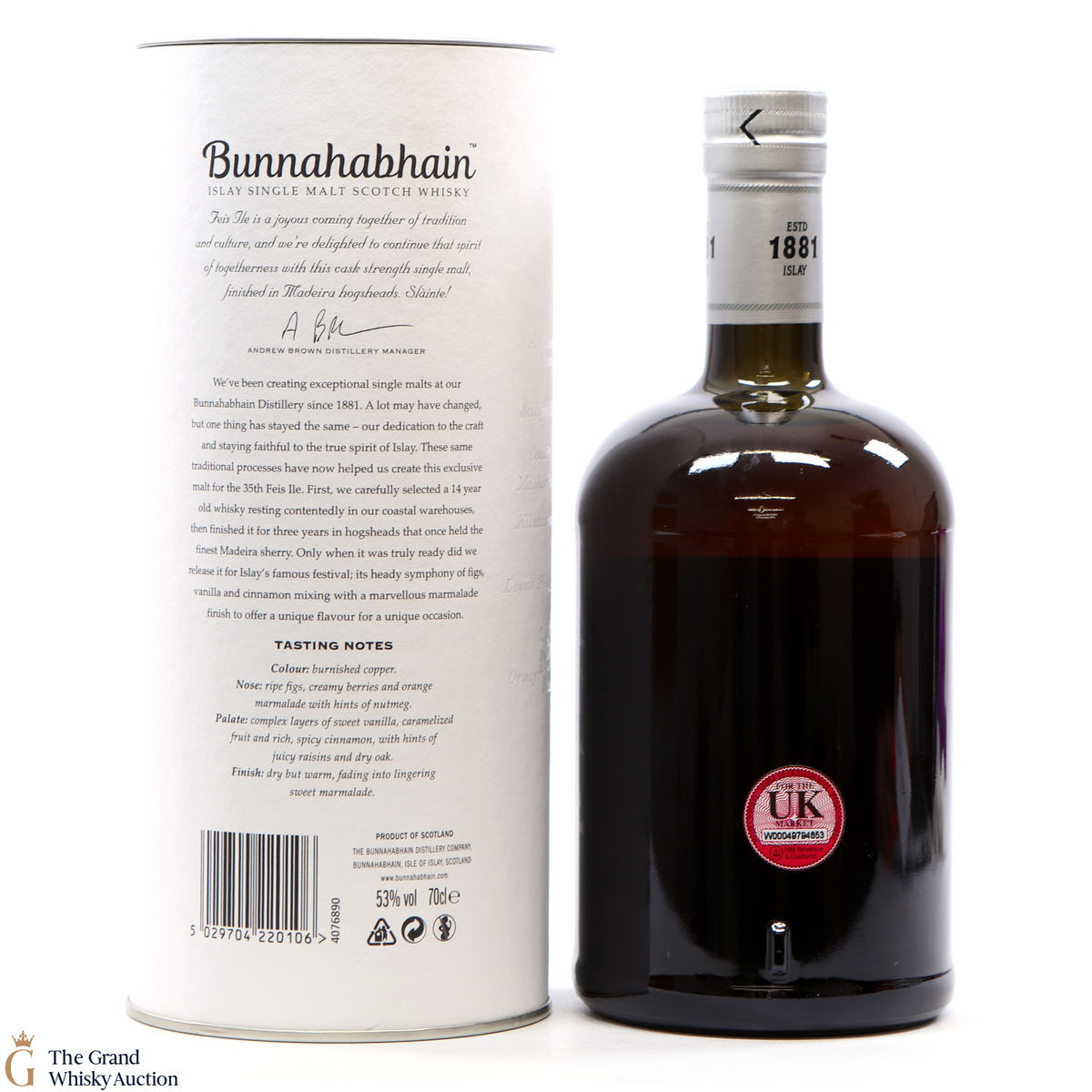 This limited edition single malt from Bunnahabhain Distillery was matured for 14 years in classic bourbon barrels, then finished in Madeira casks for another three years. Bottled at 53%, and released by Bunnahabhain for the 25th anniversary of Fèis Ìle - Fèis Ìle 2020. This is one of only 1164 bottles produced.