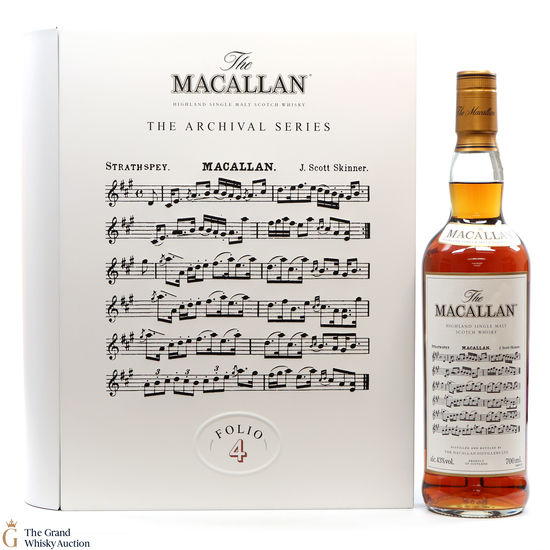 Folio 4: The fourth edition in the Archival Series from The Macallan. Folio 4 remembers the legendary advertising campaigns of the 1970s, 1980s and 1990s that brought The Macallan to the public’s attention outside of Scotland. It is presented in a beautiful book-shaped, tin case. It features an advertisement including a Strathspey composed by James Scott Skinner (1843-1927). The advert notes that Skinner was so moved by his favourite malt he created a unique piece of music featuring his signature lilting notes with the simple catchphrase: “The Macallan. The Malt.” Bottled at 43% ABV, 70cl.