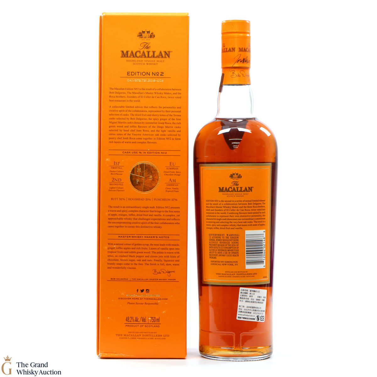 This is the second release from the Macallan Edition series. Edition No.2 is a collaboration between Macallan's master blender Bob Delgarno and legendary Spanish chefs Joan, Josep and Jordi Roca. The Rocas are the three brothers behind El Celler de Can Roca (named Best Restaurant in the World twice by Restaurant magazine). This single malt was drawn from a combination of sherry puncheons, butts and refill hogsheads.