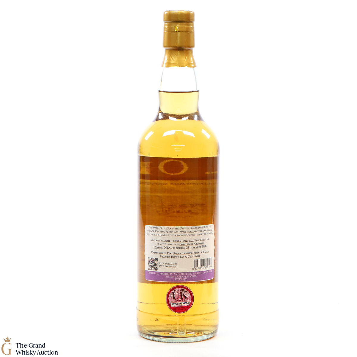 This blended Orcadian malt was matured in a refill sherry hogshead, this single cask of vatted malt was distilled in Kirkwall 1st April 2010 and bottled 28th August 2018 for The Whisky Barrel Ltd.